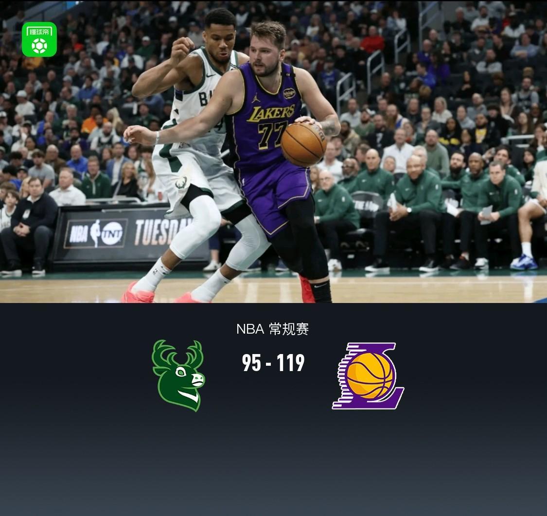 第四节,开节段东契奇、字母哥均在场下休息,雄鹿波蒂斯、特伦特连续三分一波9-2追至13分分差,随后湖人里夫斯三分止血,雄鹿延续手感特伦特、字母哥相继三分,紧跟湖人里夫斯继续回应两记三分稳住局面,随后雄鹿追分势头终止,湖人东契奇、拉拉维亚相继罚球得分将分差拉大至20分以上,比赛还剩3分多钟,失去悬念双方逐渐换主力,全场结束,湖人119-95大胜雄鹿。
