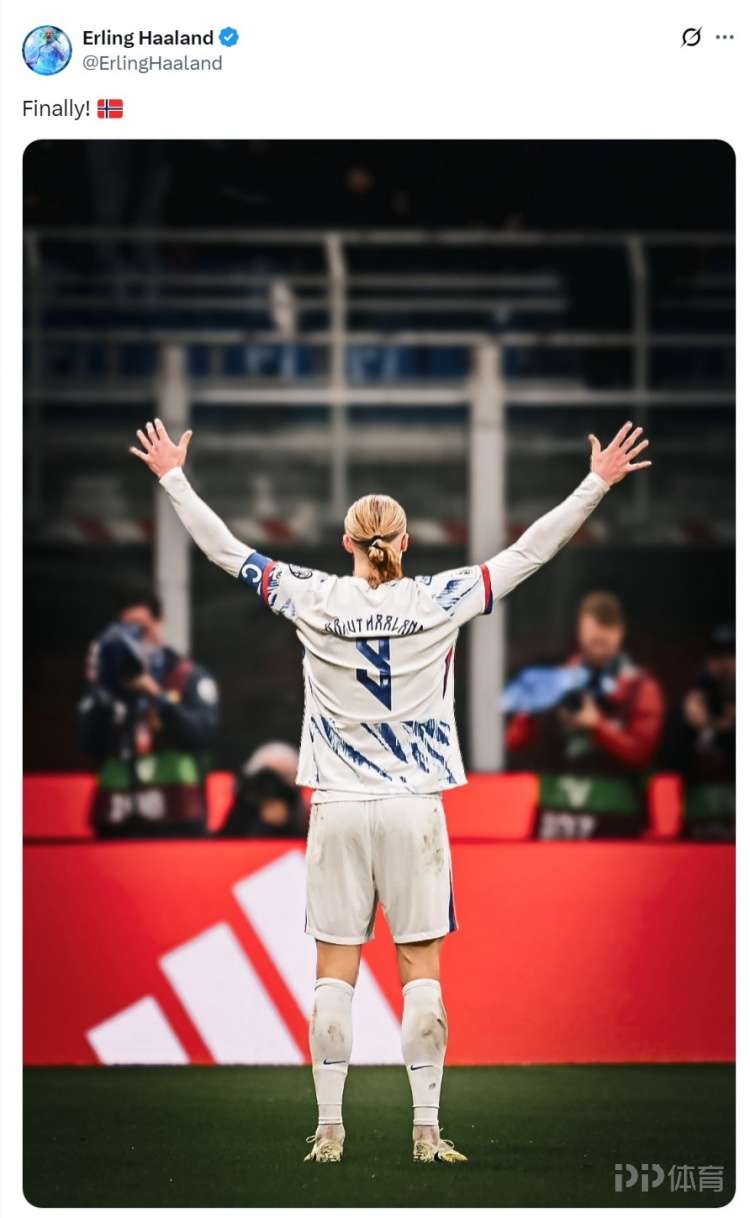 哈兰德更新社媒动态,晒出自己庆祝的背影照片,配文:“终于!”