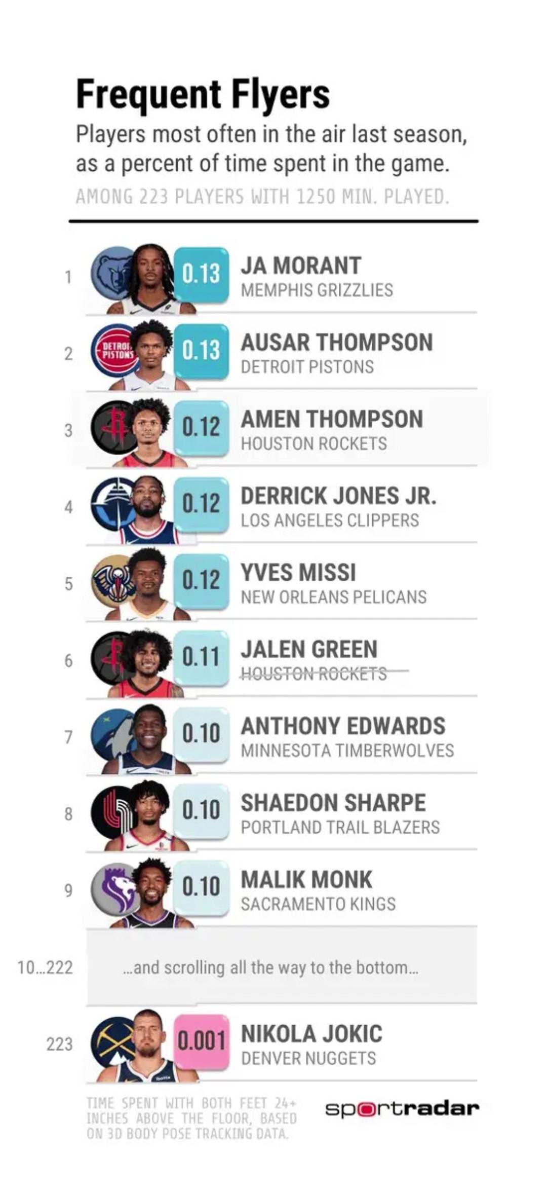 上赛季空中时间最长与最短球员莫兰特和约基奇都是top1